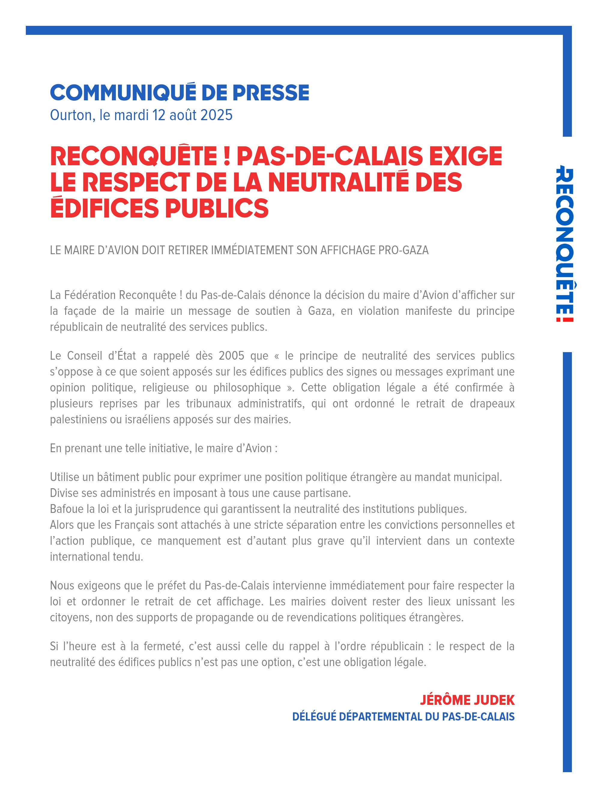 RECONQUÊTE ! PAS-DE-CALAIS EXIGE LE RESPECT DE LA NEUTRALITÉ DES ÉDIFICES PUBLICS
