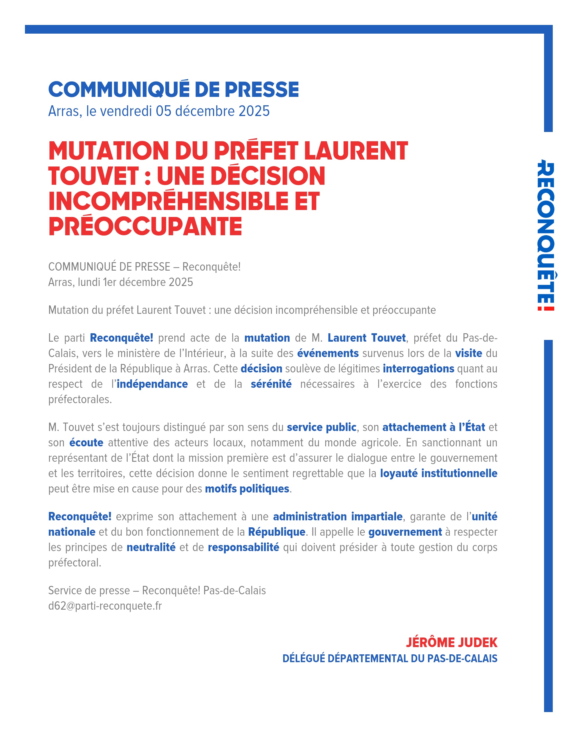 Le parti Reconquête! prend acte de la mutation de M. Laurent Touvet, préfet du Pas-de-Calais, vers le ministère de l’Intérieur, à la suite des événements survenus lors de la visite du Président de la République à Arras. Cette décision soulève de légitimes interrogations quant au respect de l’indépendance et de la sérénité nécessaires à l’exercice des fonctions préfectorales.